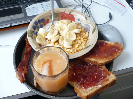 Cereal with banana, bacon, grapefruit juice, bread and strawberry jam—now that’s a breakfast you can be excited to wake up for! I’m going to ask her to make me honey bread for next week. I’m thinking French toast.