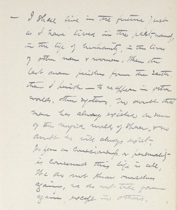 – I shall live in the future, just as I have lived in the past, namely, in the life of humanity, in the lives of other men and women. When the last man perishes from the earth, then I perish — to reappear in other worlds, other systems. No doubt that man has always existed on some of the myriads of worlds of space, and no doubt he will always exist. So far as consciousness or personality is concerned this life is all. We do not know ourselves again, we do not take form again, except in others.