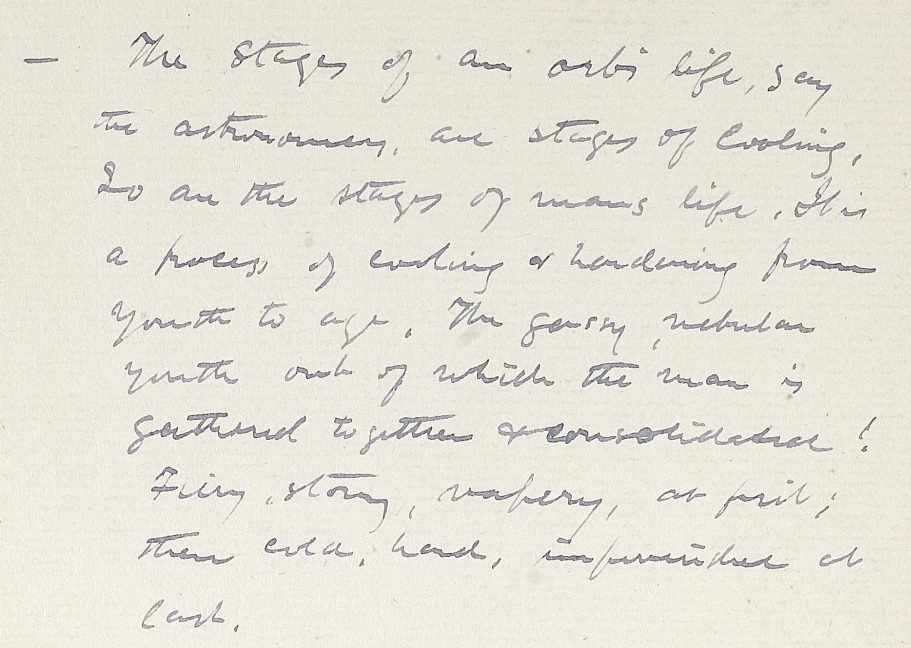 The stages of an orb’s life, say the astronomers, are stages of cooling. So are the stages of a man’s life. It is a process of cooling and hardening from youth to age. The gassy, nebular youth out of which the man is gathered together and consolidated! Fiery, strong, vapery, at first; then cold, hard, impoverished at last.