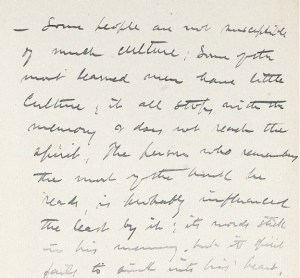 – Some people are not susceptible of much culture. Some of the most learned men have little culture; it all stops with the memory and does not reach the spirit. The person who remembers the most of the book he reads, is probably influenced the least by it; its words stick in his memory, but its spirit fails to sink into his heart.
