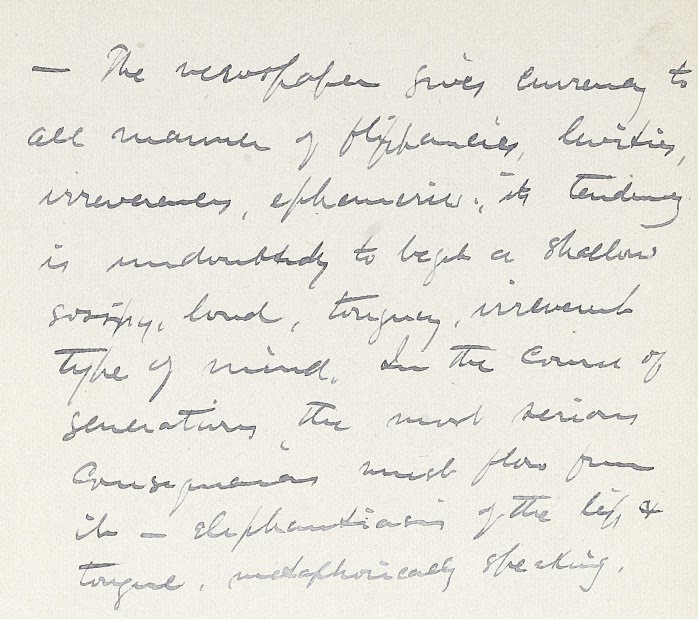 – The newspaper gives currency to all manner of flippancies, levities, irreverences, ephemeries; its tendency is undoubtedly to beget a shallow, gossipy, loud, tonguey, irreverent type of mind. In the course of generations, the most serious consequences must flow from it – elephantiasia of the lip and tongue, metaphorically speaking.