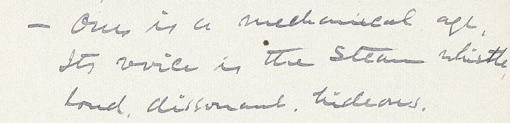 – Ours is a mechanical age. Its voice is the steam whistle loud, dissonant, hideous.