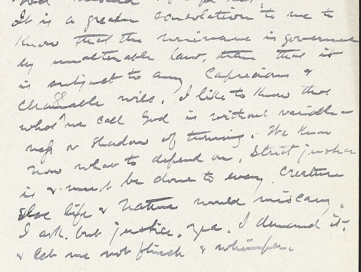 It is a greater consolation to me to know that the universe is governed by unalterable law, than that it is subject to any capricious and changeable will. I like to know that what we call God is without variable-ness or shadow of turning. We know now what to depend on. Strict justice is and must be done to every creatur else life and nature would miscarry. I ask but justice, yes, I demand it, and let me not flinch and whimper.