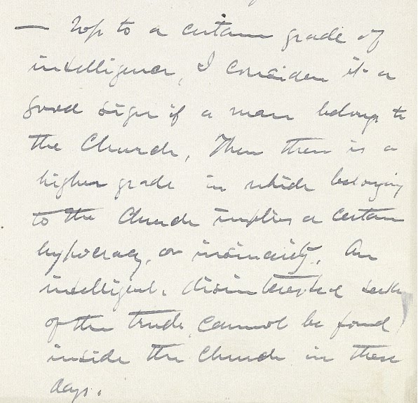 – Up to certain grade of intelligence, I consider it a good sign if a man belongs to the Church. Then there is a higher grade in which belonging to the Church implies a certain hypocrisy, or insincerity. An intelligent, disinterested seeker of the truth cannot be found inside the Church in these days.