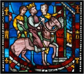 For the purpose of depth, the nose of the hose poking through the portal is enough to indicate the narrative motion of the story. Rather than depth, the strength of stained glass lies in color and radiance. The majority of this panel is occupied by vibrant blues, deep reds, and golden yellows. A number of secondary colors illuminate smaller areas: green (on cloak of the leftmost rider, on the vertical elements of the portal, and on the trappings of the king’s horse), light blue (for the middle horse, and the brickwork); white (on the backmost horse, and several of the architectural elements; and flesh tones, which vary slightly in the case of each figure.