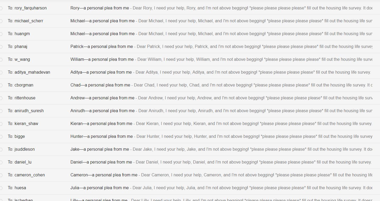 - I learned how to use mail merge in order to generate and send out personalized emails to 200+ Lowellians guilting them into filling out their House survey. I was really pleased with myself on this one.