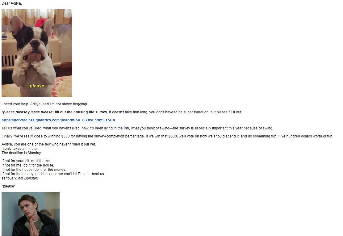 - I also have a Fairfax email list that we use internally to the house, and I use to send out meme-filled, entertaining (I hope) emails about why they need to lock their doors and not use the fire escapes to smoke cigarettes. In my weaker moments, I like to flatter myself and think my email skills rival Beth’s. I also incentivize my emails such that if you don’t read them, you’re generally missing out on free food. And no one wants to miss out on food.