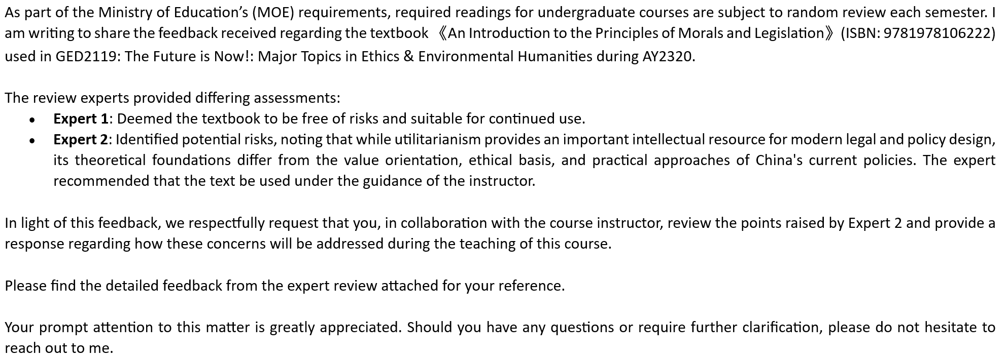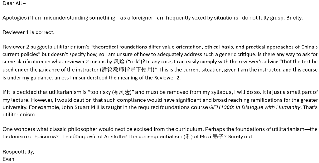 I scrolled down to find the following feedback from the Chinese Minestry of Education. They had been reviewing my course materials, and found one of my texts to be an issue. Copied here is the concern: